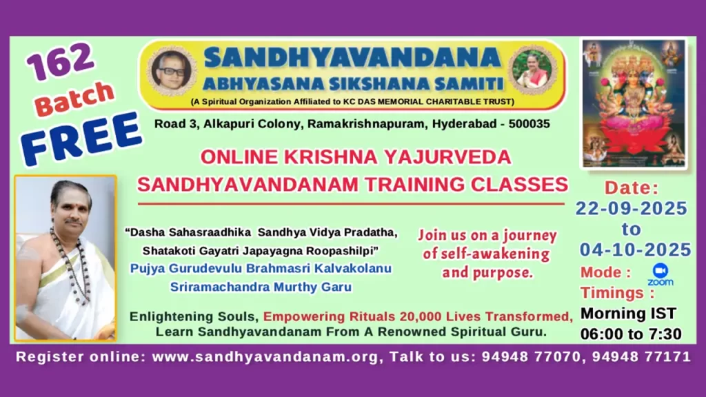 సంధ్యావందన అభ్యసనా శిక్షణా సమితి ద్వారా 161 వ యజుర్వేద సంధ్యావందన శిక్షణా శిబిరం ఆగస్ట్ 4, 2025 నుండి ప్రారంభం కానున్నది. 15 రోజులలో స్వర, ముద్రా సహితముగా యజుర్వేద సంధ్యావందనం సశాస్త్రీయము గా ఉపవీతులైన వారికి గురుముఖతః నేర్చుకునే మహదవకాశం.